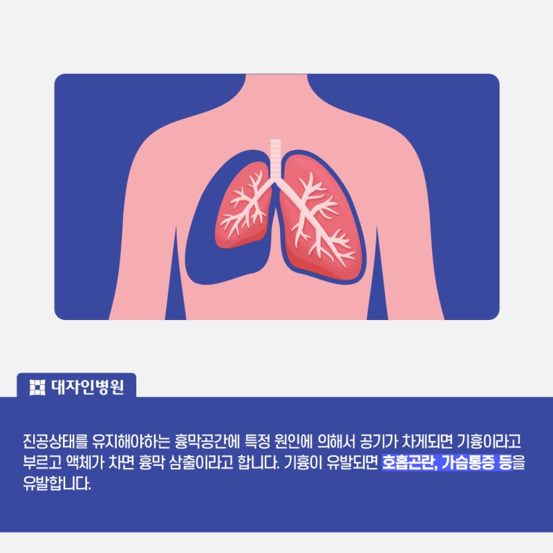 기흉(氣できた)은 폐에 생긴 구멍으로 공기가 새어나와 늑막강 안에 공기가 고이는 질환을 말합니다. 새는 공기의 양이 늘어날수록 폐가 제대로 기능하지 않습니다. 또한 흉강 내로 유입되는 공기가 배출되지 않을 경우 양쪽 폐와 심장 사이의 공간과 심장이 한쪽으로 집중되어 응급상황이 발생할 수 있습니다.기흉증상