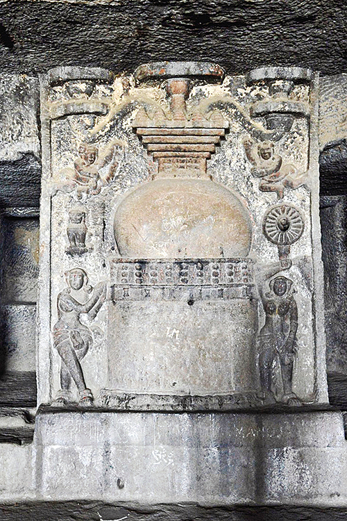 부처를 상징하는 탑은 높은 기단 위에 난간이 있는 반구형 몸체를 하고 있으며, 윗부분은 우산형이다. 동굴 입구 좌우에 물문신이 있는 차이티야 동굴은 보기 드물다. 오른쪽 이미지는 사라지고 이제 왼쪽 이미지만 남습니다.