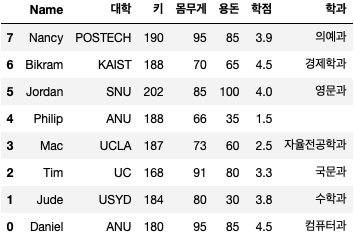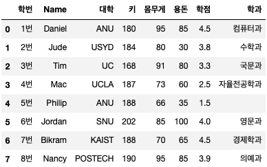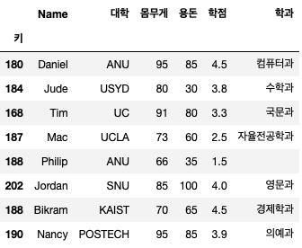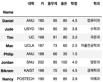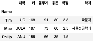 Index(('Name', '대학', '키', '몸무게', '용돈', '학점', '학과'), dtype="object")