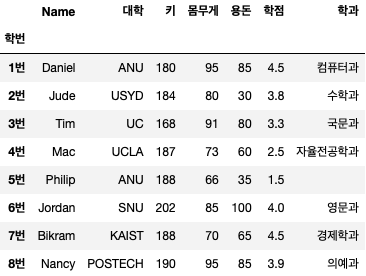 위의 코드를 실행하면 첫 번째 데이터 프레임과 달리 인덱스 컬럼에 “학번”이라는 이름이 부여된다.