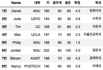df = pd.DataFrame(example_data, index = ('1번','2번','3번','4번','5번','6번','7번','8번'))