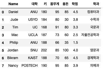 Index(('Name', '대학', '키', '몸무게', '용돈', '학점', '학과'), dtype="object")