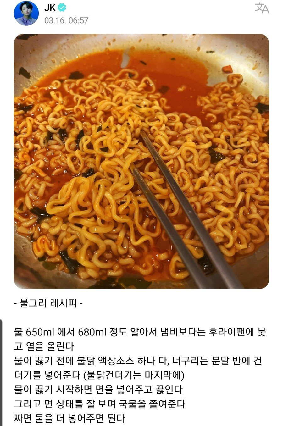 방탄소년단 정국 불그리 레시피