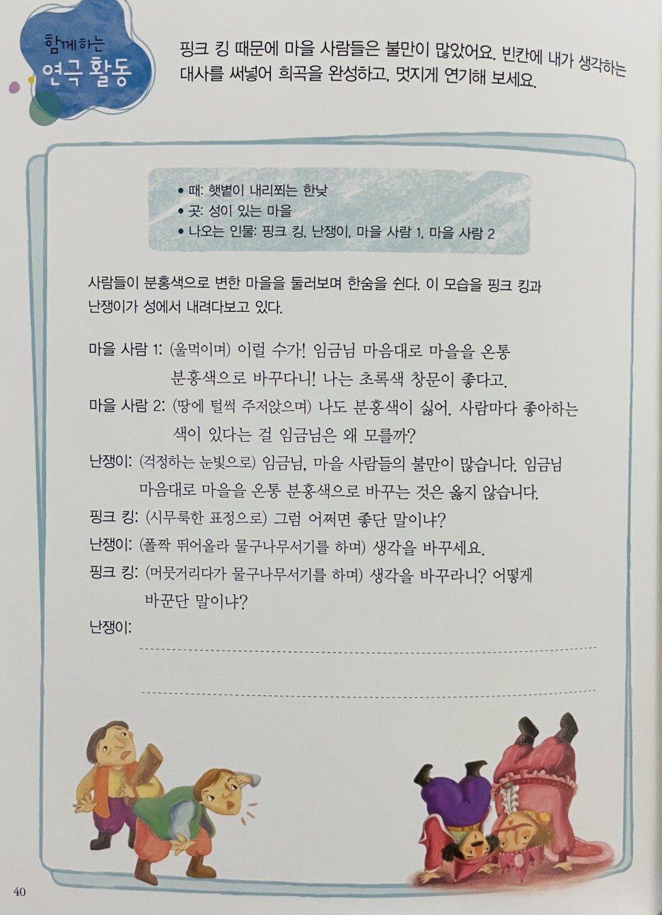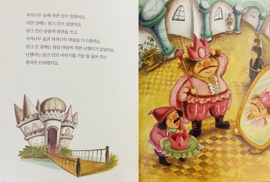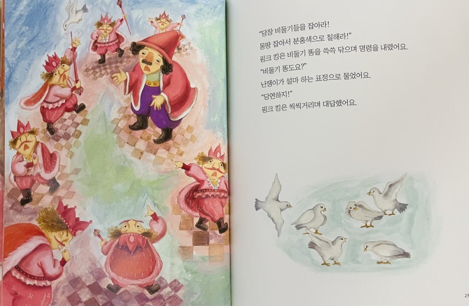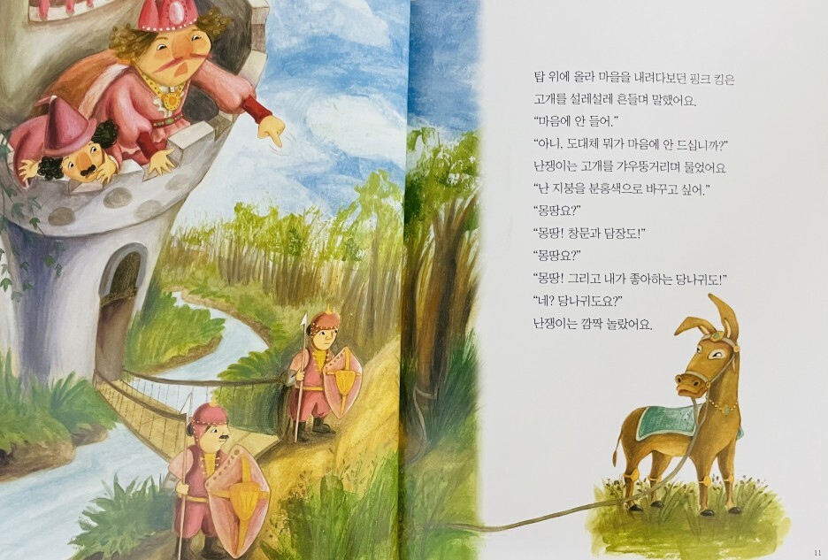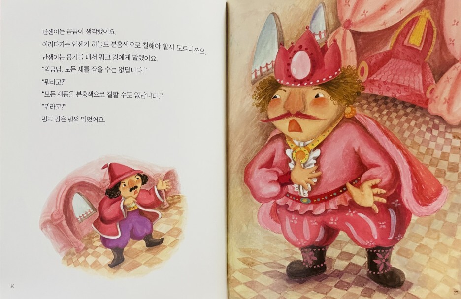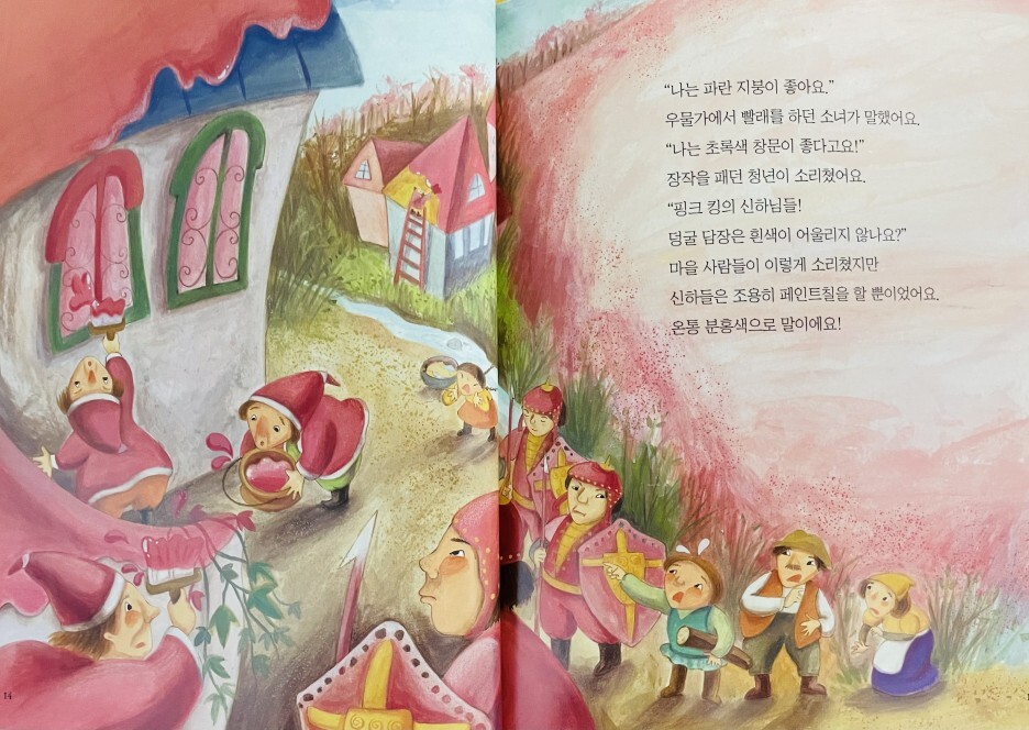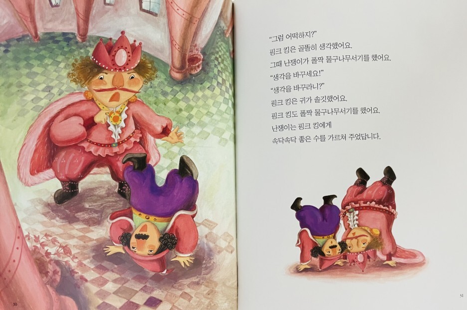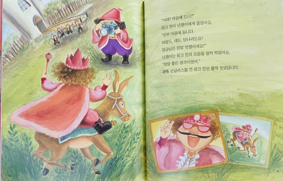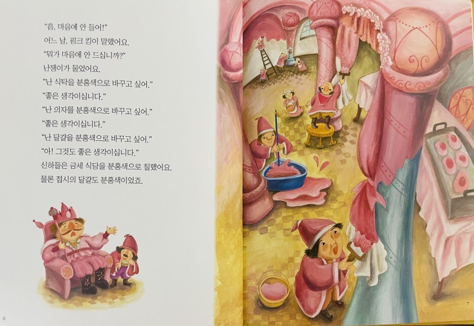 분홍색을 좋아하는 분홍왕은 병사들의 갑옷과 방패, 마을의 지붕과 울타리를 분홍색으로 칠하라고 명령했습니다. 그는 심지어 당나귀나 비둘기 똥처럼 절대 바꿀 수 없는 것들은 분홍색으로 칠하라고 지시했습니다. 마을 사람들은 불만이 가득했지만 왕의 명령이었기 때문에 아무도 반대하지 않았다. 이때 분홍왕의 충직한 신하 드워프는 “누구나 자신이 좋아하는 색이 있다”며 분홍왕에게 새로운 아이디어를 냈다. 모든 성과 마을을 분홍색으로 바꾸는 대신, 그들은 분홍색 왕에게 분홍색 선글라스를 쓰게 했습니다. 이러한 생각의 변화 덕분에 왕과 군인, 마을 사람들 모두 만족했다.
