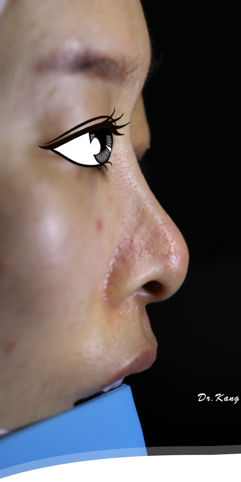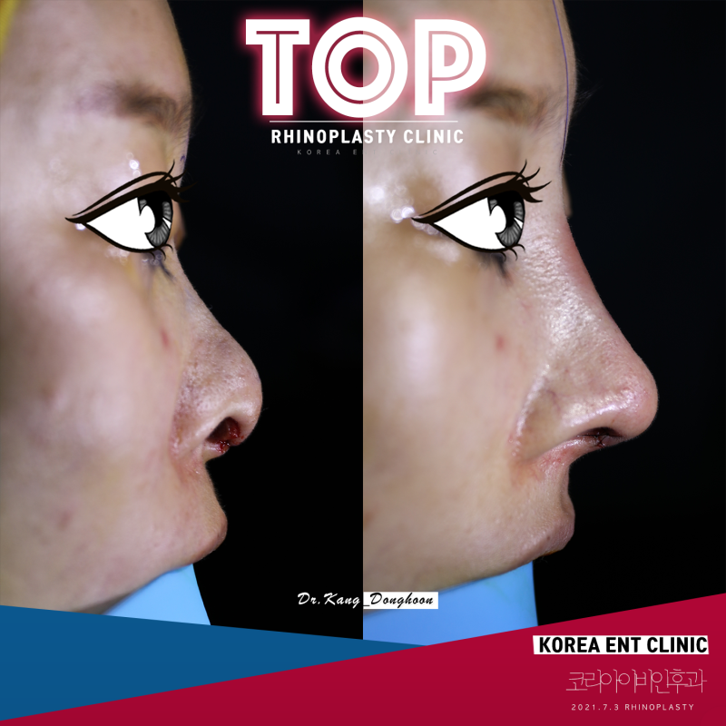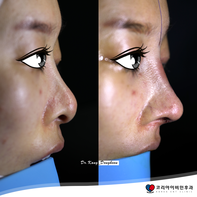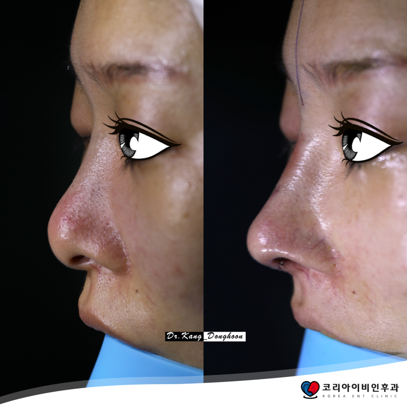 *수술 전/후 사진 및 영상은 밝기 조절 외에는 아무런 보정 없이 Canon EOS 5D MarkIV로 촬영하였습니다. *수술 후 사진은 최종 코 모양이 아닙니다. 피부의 부종으로 인해 콧대 위의 근위부가 보형물의 실제 높이보다 높게 보입니다. 또한 코끝의 최종 형태는 수술 후 9개월이 지나야 알 수 있습니다.